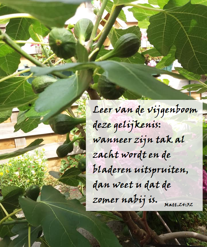“En leert van de vijgenboom deze gelijkenis; wanneer nu zijn tak teder wordt, en de bladeren uitspruiten, zo weet gij, dat de zomer nabij is. Alzo ook gij, wanneer gij deze dingen zult zien geschieden, zo weet, dat [het] nabij, voor de deur is” (Markus 13:28-29)