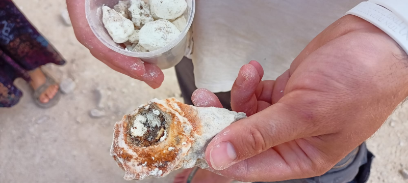 Ook zijn we in Sodom en Gomorra geweest (althans wat er van over is), Die gele balletjes zijn sulfer ballen. Hier in deze steen zie je hoe de omranding verbrand is en het in die steen ingebrand is.