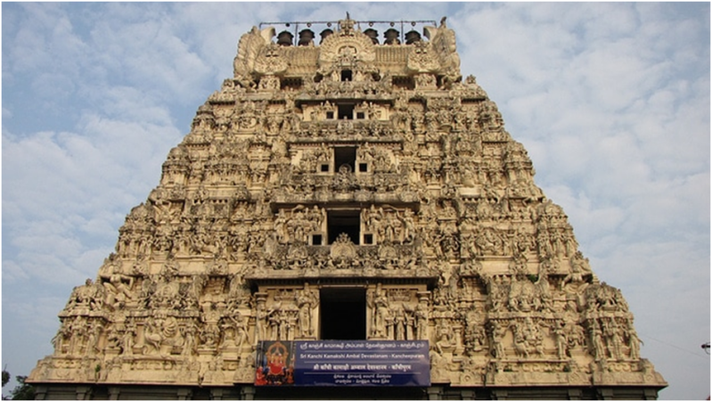 De buitenkant van de hindoetempels is vaak verrijkt met een overvloed van beeldhouwwerk, zoals op deze tempelpoort uit Kanchipuram.