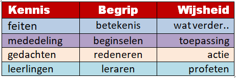 - De Bijbel gebruikt de woorden Kennis, Begrip en Wijsheid vaak afwisselend, maar soms worden ze apart en duidelijk gebruikt. Het kan daarom nuttig zijn om de verschillende betekenissen te beschrijven.
