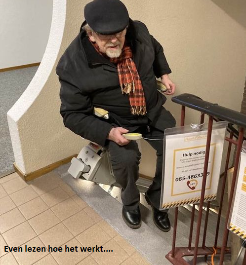 De lift in onze flat is buitenwerking. Nu hebben we Nood-Lift Stoeltjes. Op elke verdieping met je éen keer overstappen. (dubbel trap) Ik moest vanmorgen van verdieping 1 naar verdieping vier en dat is 8 x overstappen.