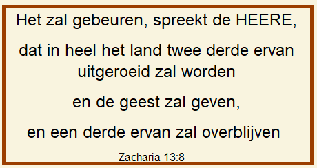 De profeet Zacharia heeft dit toen ook al gezien; slechts een derde zal in het land overblijven en twee derden zullen uitgeroeid worden. Uitgeroeid! Is dat niet verschrikkelijk?! Een klein gedeelte is maar uitverkoren en de rest wordt uitgeroeid!