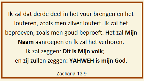 In de profetie van Zacharia spreekt de HEERE over een toekomstige zuivering van het volk. Hij zegt dat in het hele land twee derde van de mensen zal worden uitgeroeid, terwijl één derde zal overblijven. Dit overblijfsel zal door God worden gelouterd en beproefd, zoals men zilver en goud zuivert. Het is een beeld van oordeel én hoop: hoewel velen verloren gaan, blijft er een heilig en toegewijd deel over dat werkelijk God zal dienen.