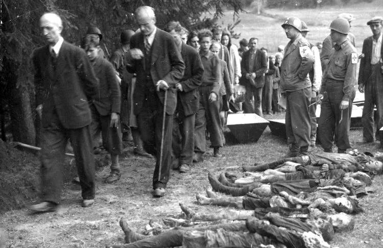 Sudeten-Duitse burgers uit Volary worden door Amerikaanse soldaten gedwongen om langs de lijken van 30 tijdens een dodenmars uitgehongerde Joodse vrouwen te lopen, zodat ze het niet kunnen ontkennen (11 mei 1945).