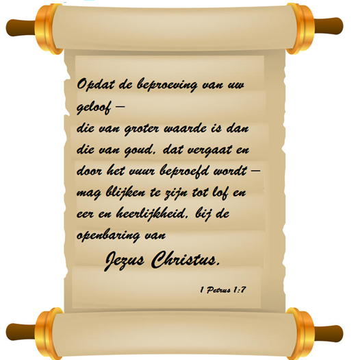 1 Petrus 1:3-7 Geprezen zij de God en Vader van onze Heere Jezus Christus, Die ons, overeenkomstig Zijn grote barmhartigheid, opnieuw geboren deed worden tot een levende hoop, door de opstanding van Jezus Christus uit de doden, 4. tot een onvergankelijke, onbevlekte en onverwelkbare erfenis, die in de hemelen bewaard wordt voor u. 5. U wordt immers door de kracht van God bewaakt door het geloof tot de zaligheid, die gereedligt om geopenbaard te worden in de laatste tijd. 6. Daarin verheugt u zich, ook al wordt u nu voor een korte tijd – als het nodig is – bedroefd door allerlei verzoekingen, 7. opdat de beproeving van uw geloof – die van groter waarde is dan die van goud, dat vergaat en door het vuur beproefd wordt – mag blijken te zijn tot lof en eer en heerlijkheid, bij de openbaring van Jezus Christus.