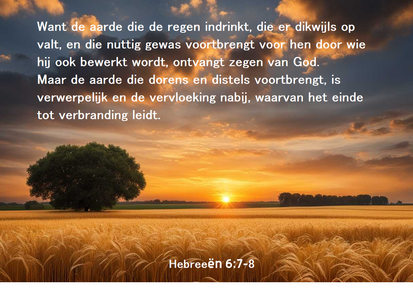 Want de aarde die de regen indrinkt.........die nuttig gewas voortbrengt..... ontvangt zegen van God....... zoals zo vaak in de Bijbel worden ons belangrijke principes duidelijk gemaakt, door beelden uit de natuur. Als wij Gods Woord indrinken, d.w.z. ter harte nemen, overdenken, dan ontstaat er 'nuttig gewas', en dat zijn de vruchten van de Heilige Geest, waarmee we de God van Israël eren en waardoor wij zegen ontvangen. Maar de aarde die dorens en distels voortbrengt......... dorens en distels verwijzen naar de vloek over de aarde (Genesis 3:17-18).