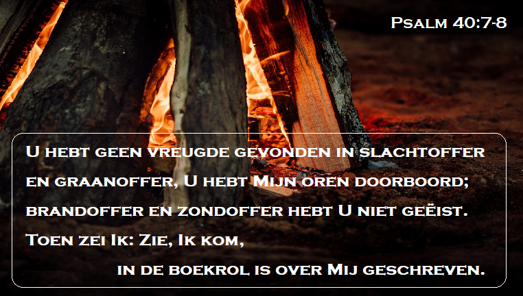 Psalm 40:7,8 U hebt geen vreugde gevonden in slachtoffer en graanoffer, U hebt Mijn oren doorboord; brandoffer en zondoffer hebt U niet geëist. Toen zei Ik: Zie, Ik kom, in de boekrol is over Mij geschreven.
