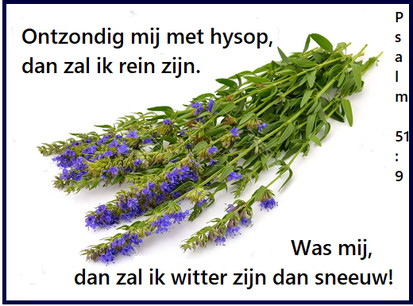 Psalm 51:7 Zie, ik ben in ongerechtigheid geboren, in zonde heeft mijn moeder mij ontvangen. 8. Zie, U vindt vreugde in waarheid in het binnenste, in het verborgene maakt U mij wijsheid bekend. 9. ONTZONDIG MIJ MET HYSOP, DAN ZAL IK REIN ZIJN, WAS MIJ, DAN ZAL IK WITTER ZIJN DAN SNEEUW..........12. Schep mij EEN REIN HART, o God, en vernieuw in mijn binnenste een standvastige geest. 13. Verwerp mij niet van voor Uw aangezicht en neem UW HEILIGE GEEST niet van mij weg.