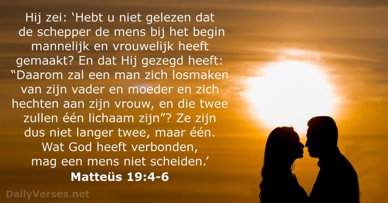 1 Korinthe 7:3-6 Laat de man aan zijn vrouw de verschuldigde bereidwilligheid betonen en evenzo ook de vrouw aan haar man. 4. De vrouw heeft niet de beschikking over haar eigen lichaam, maar de man. En evenzo heeft ook de man niet de beschikking over zijn eigen lichaam, maar de vrouw. 5. Onttrek u niet aan elkaar, behalve dan met onderling goedvinden voor een bepaalde tijd, om u te wijden aan vasten en bidden. Kom daarna weer bij elkaar, opdat de satan u niet zal verzoeken omdat u zich niet kunt onthouden. 6. Dit zeg ik echter als tegemoetkoming, niet als bevel.