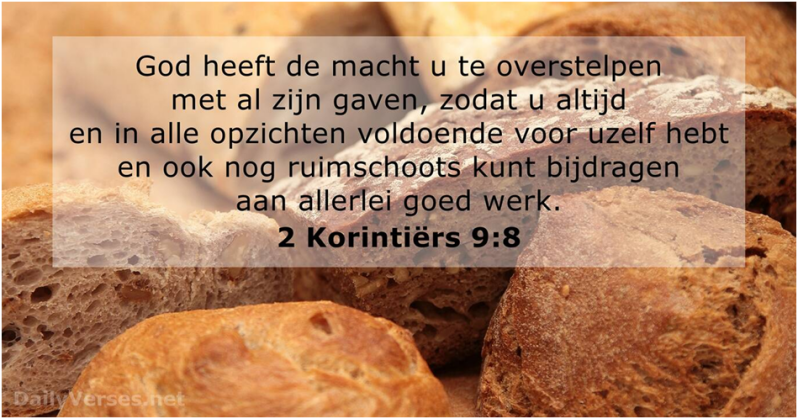 2 Korinthe 9:11 Zo zult u in alles rijk worden, in staat tot alle vrijgevigheid, die door middel van ons dankzegging aan God teweegbrengt.