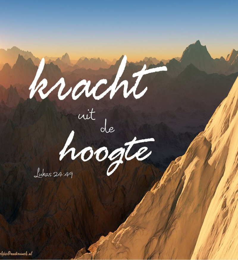 Lukas 24:49 En zie, Ik zend de belofte van Mijn Vader op u; maar blijft u in de stad Jeruzalem, totdat u met kracht uit de hoogte bekleed zult worden.