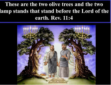 Zij zijn de twee olijfbomen en de twee kandelaars, die voor de God van de aarde staan....... In het boek Openbaringen vinden we veel verwijzingen naar de profeten in het eerste testament. Hier verwijst Johannes, namens Yeshua, naar Zacharia 4, waar de profeet de profeet in een visioen een gouden kandelaar met zeven lampen ziet, die d.m.v. toevoerbuisjes gekoppeld is aan twee olijfbomen. De olijfolie afkomstig uit deze bomen maken dat de lampen onafgebroken kunnen branden.