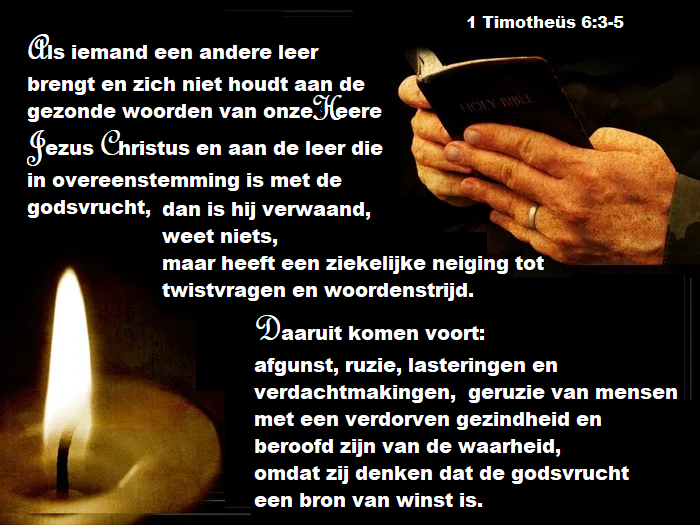 1 Timotheüs 6:11-16 U echter, o mens die God toebehoort, ontvlucht deze dingen. Jaag daarentegen gerechtigheid, godsvrucht, geloof, liefde, volharding en zachtmoedigheid na. 12. Strijd de goede strijd van het geloof. Grijp naar het eeuwige leven, waartoe u ook geroepen bent en de goede belijdenis afgelegd hebt voor vele getuigen. 13. Ik beveel u voor God, Die alle dingen levend maakt, en voor Christus Jezus, Die onder Pontius Pilatus de goede belijdenis afgelegd heeft, 14. dit gebod onbevlekt en onberispelijk in acht te nemen, tot de verschijning van onze Heere Jezus Christus. 15. De zalige en alleen machtige Heere, de Koning der koningen en Heere der heren, zal die op Zijn tijd laten zien, 16. Hij Die als enige onsterfelijkheid bezit en een ontoegankelijk licht bewoont; Hem heeft geen mens gezien en niemand kan Hem ook zien. Hem zij eer en eeuwige kracht. Amen.