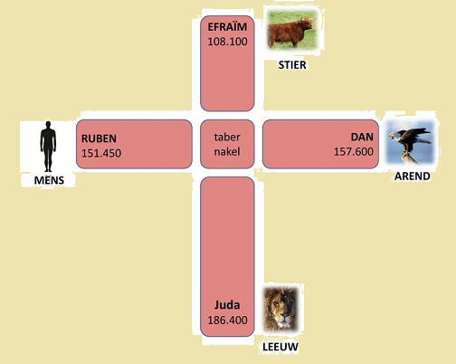 In een artikel over Numeri 2 beschreven we al dat de stammen van Israël die rondom de tabernakel stonden opgesteld de cherubs/wezens/dieren rondom Gods troon uitbeeldden: