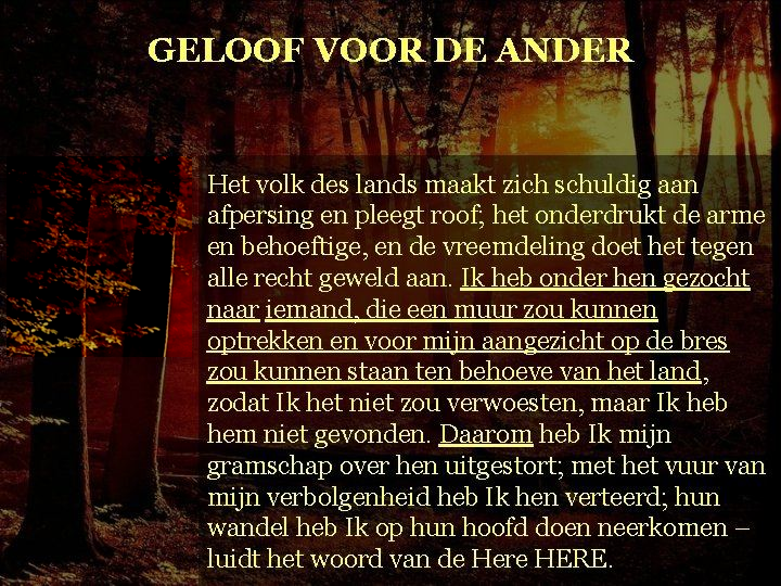 TUSSEN HEILIG EN ONHEILIG, TUSSEN REIN EN ONREIN WORDT GEEN ONDERSCHEID MEER GEMAAKT. EEN DAG VAN RUST OM GOD, MEER DAN OP ANDERE DAGEN MOGELIJK IS, TE VERHEERLIJKEN, BESTAAT NIET MEER! DESONDANKS WORDT ER GEPREDIKT: „ZO SPREEKT DE HERE!”, DOCH NIET DE HERE MAAR HET EIGEN HART HEEFT GESPROKEN (Ezechiël 13:2,3).