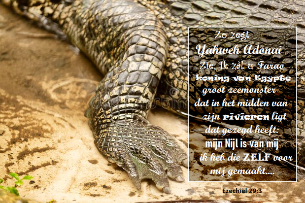 Ezechiël 29:3 Zo zegt de Heere HEERE: Zie, Ik zál u, farao, koning van Egypte, groot zeemonster (hier staat tannin תַּנִּים “), dat in het midden van zijn rivieren ligt, dat gezegd heeft: Mijn Nijl is van mij en ik heb die zelf voor mij gemaakt!