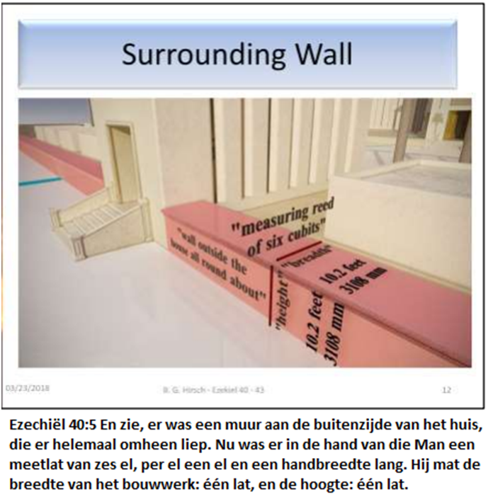 Rondom de tempel is een 3 meter hoge muur. De muur maakt scheiding tussen het heilige en onheilige (Eze 42:20). Het “Heilige der Heiligen” is zowel in de tabernakel als in de tempels het allerheiligste gebied, daar waar YAHWEH troont. Het is ook als een kubus gevormd, de hoogte, de breedte en de lengte hebben allemaal dezelfde afmetingen. Zo is ook het Nieuwe Jeruzalem, dat al klaar staat in de hemel, maar neer zal dalen op aarde, de uiteindelijke vorm. Dit zal ná de duizend jaar plaatsvinden. Dan is het echt zo dat God bij de mensen woont. Dan is YAHWEH alles in allen. (1 Kor. 15:28) Maar eerst moeten de onheilige en minder heilige dingen hun waarde verliezen. Dan zal ook het “heilige” uit tabernakel en tempel hebben afgedaan. Hebreeën 9:8. Dan blijft de kubus: het Heilige der Heiligen / het Nieuwe Jeruzalem over als een immens grote werkelijkheid en heiligheid.