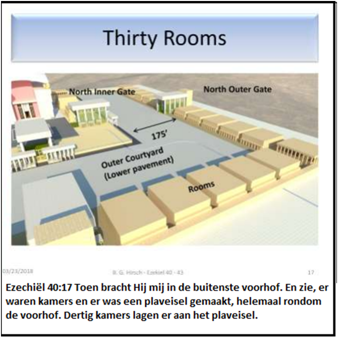 Als je de animatievideo hebt bekeken zijn je de dertig vierkantjes aan de noord, oost en zuidrand van het tempelcomplex je ongetwijfeld opgevallen. Het zijn dertig (drie maal tien) vertrekken die bestemd zijn voor de tempelbezoekers of voor de Levieten. Esther Noordermeer noemde ze restaurants in haar video over “Het Millennium”. “Want”, zei ze, “waar geofferd wordt, wordt ook gegeten”. Het woordje “restaurant” is dan wel niet in de Bijbel terug te vinden, maar dat neemt niet weg dat er wel een kern van waarheid in zit. Bij de Bijbelse feesten komen er veel feestgangers.