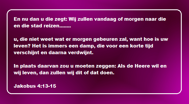 Jeremia 42:19-22 De HEERE heeft tot u gesproken, overblijfsel van Juda. Ga Egypte niet binnen! U moet goed weten dat ik u heden gewaarschuwd heb. 20. Ja, u hebt uzelf misleid. Ú immers hebt mij tot de HEERE, uw God, gezonden om te zeggen: Bid voor ons tot de HEERE, onze God. En overeenkomstig alles wat de HEERE, onze God, zal zeggen, maak dat zo ons bekend, en wij zullen het doen. 21. Nu heb ik het u heden bekendgemaakt, maar u hebt niet willen luisteren naar de stem van de HEERE, uw God, namelijk naar alles waarmee Hij mij tot u heeft gezonden. 22. Nu dan, u moet goed weten dat u sterven zult door het zwaard, door de honger en door de pest, in de plaats waarheen u geneigd was te gaan om daar als vreemdeling te verblijven.