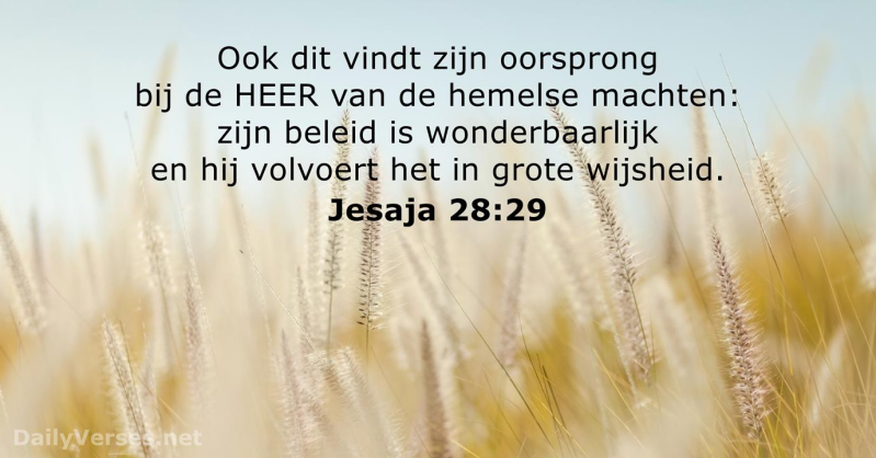 Jesaja 28:29 Ook dit gaat uit van de HEERE van de legermachten. Hij is wonderbaar van raad, Hij is groot in wijsheid.