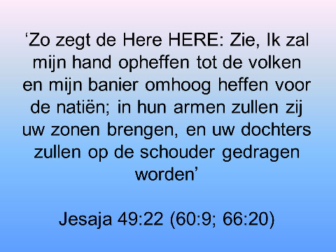 Laat die tekst die je hier links leest eens goed op je inwerken. Yahweh geeft een teken: het opheffen van Zijn hand en Zijn banier en dan komen er mensen uit allerlei landen om de zonen en dochters van de Israëlieten te brengen. De kleintjes dragen ze in hun armen en de grotere kinderen zitten op hun schouders. En er zijn vanzelfsprekend ook massa volwassen kinderen. Maar de heidenvolken die zijn overgebleven na het oordeel die zorgen ervoor dat ze naar huis kunnen.