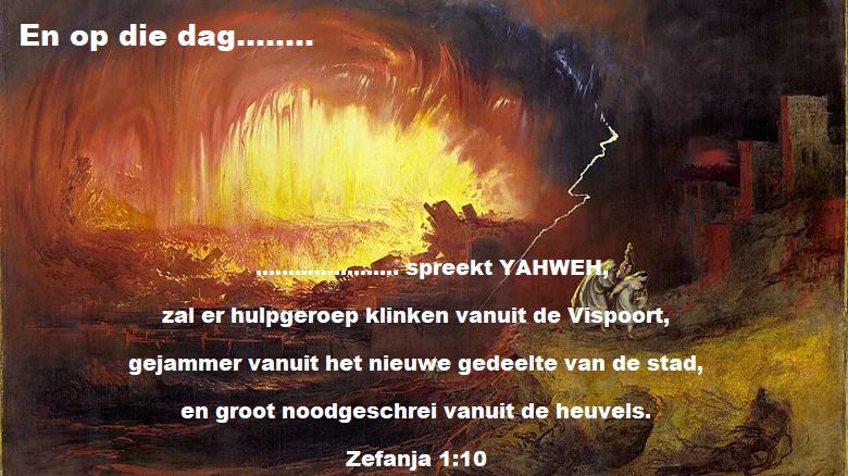 Zefanja 1:10-11 En op die dag, spreekt de HEERE, zal er hulpgeroep klinken vanuit de Vispoort, gejammer vanuit het nieuwe gedeelte van de stad, en groot noodgeschrei vanuit de heuvels. 11. Weeklaag, inwoners van de Vijzelwijk, want heel het volk van kooplieden is omgebracht, allen die geld afwegen zijn uitgeroeid.