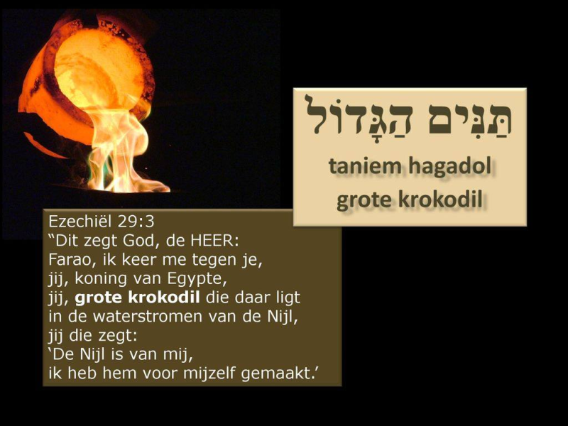 Ezech. 29:3 Zo zegt de Heere HEERE: Zie, Ik zál u, farao, koning van Egypte, groot zeemonster (hier staat ook “tannin תַּנִּים “), dat in het midden van zijn rivieren ligt, dat gezegd heeft: Mijn Nijl is van mij en ik heb die zelf voor mij gemaakt!