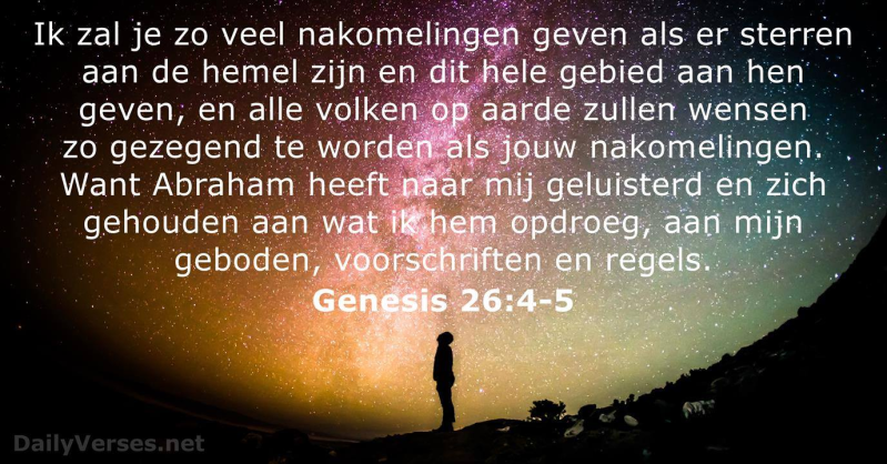 Genesis 26:4 En Ik zal uw zaad vermenigvuldigen, als de sterren des hemels, en zal aan uw zaad al deze landen geven; en in uw zaad zullen gezegend worden alle volken der aarde,