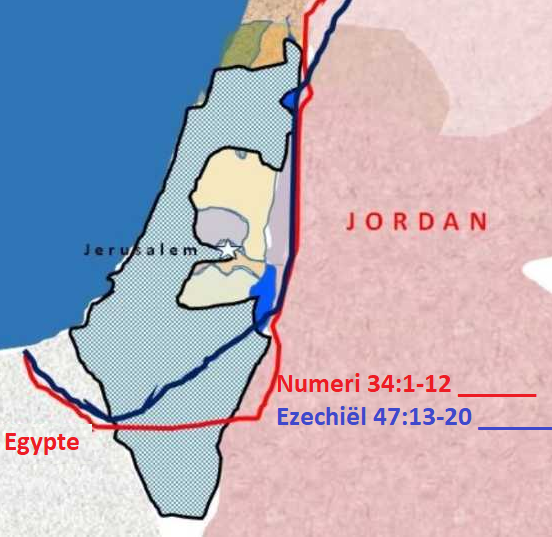 In bijgaand plaatje is met de rode lijn aangegeven hoe ongeveer de grenzen behoren te lopen volgens de aanwijzingen van Numeri 34:1-12. De blauwe lijn is aangebracht aan de hand van de aanwijzingen in Ezechiël 47: 13-20.