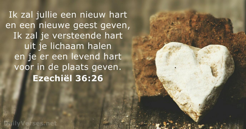 Ezechiël 36:25-29 Ik zal REIN WATER op u sprenkelen en u zult REIN worden. Van al uw onreinheden en van al uw stinkgoden zal Ik u REINIGEN. 26. Dan zal Ik u een nieuw hart geven en een nieuwe geest in uw binnenste geven. Ik zal het hart van steen uit uw lichaam wegnemen en u een hart van vlees geven. 27. Ik zal Mijn Geest in uw binnenste geven. Ik zal maken dat u in Mijn verordeningen wandelt en dat u Mijn bepalingen in acht neemt en ze houdt. 28. U zult wonen in het land dat Ik uw vaderen gegeven heb, u zult een volk voor Mij zijn en Ík zal een God voor u zijn. 29. Ik zal u verlossen van al uw onreinheden. Ik zal roepen tegen het koren en Ik zal het veel doen worden: Ik zal u geen hongersnood opleggen.
