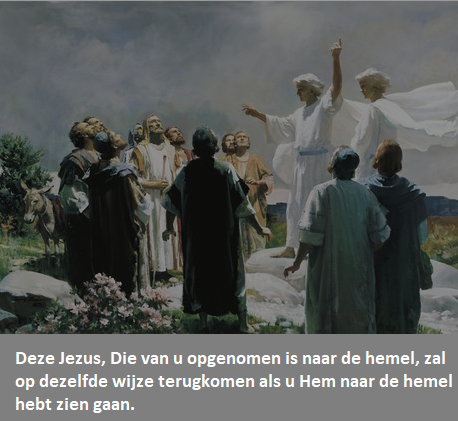 Handelingen 1:4-11 4 En toen Hij met hen samen was, beval Hij hun dat zij niet uit Jeruzalem weg zouden gaan, maar de belofte van de Vader zouden verwachten, die u, zei Hij, van Mij gehoord hebt; 5. want Johannes doopte wel met water, maar u zult met de Heilige Geest gedoopt worden, niet lang na deze dagen. 6. Zij dan die samengekomen waren, vroegen Hem: Heere, zult U in deze tijd voor Israël het Koninkrijk weer herstellen? 7. En Hij zei tegen hen: Het komt u niet toe de tijden of gelegenheden te weten die de Vader in Zijn eigen macht gesteld heeft, 8. maar u zult de kracht van de Heilige Geest ontvangen, Die over u komen zal; en u zult Mijn getuigen zijn, zowel in Jeruzalem als in heel Judea en Samaria en tot aan het uiterste van de aarde. 9. En nadat Hij dit gezegd had, werd Hij opgenomen terwijl zij het zagen, en een wolk onttrok Hem aan hun ogen. 10. En toen zij, terwijl Hij van hen wegging, hun ogen naar de hemel gericht hielden, zie, twee mannen stonden bij hen in witte kleding, 11. die ook zeiden: Galilese mannen, waarom staat u omhoog te kijken naar de hemel? Deze Jezus, Die van u opgenomen is naar de hemel, zal op dezelfde wijze terugkomen als u Hem naar de hemel hebt zien gaan.12. Toen keerden zij terug naar Jeruzalem, van de berg die de Olijfberg genoemd wordt, die vlak bij Jeruzalem is en daar een sabbatsreis vandaan ligt.